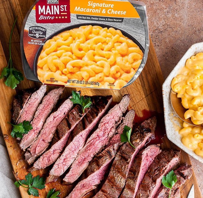 4. While steak rests, heat Main St Bistro Signature Macaroni & Cheese for 5 minutes in microwave per package directions.