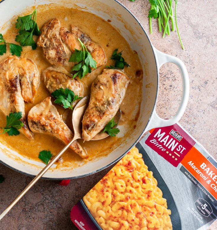 5. While sauce thickens, heat Main St Bistro Baked Macaroni & Cheese per package directions.