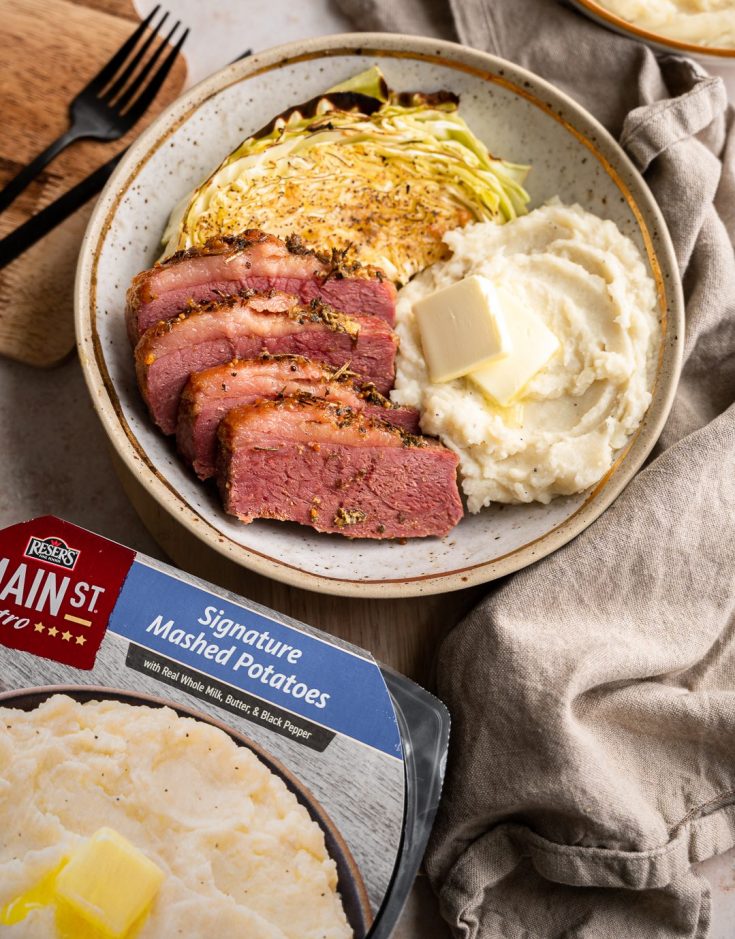 6. Let corned beef rest for 10 minutes then slice and serve with roasted cabbage and Main St Bistro® Signature Mashed Potatoes heated per package instructions.