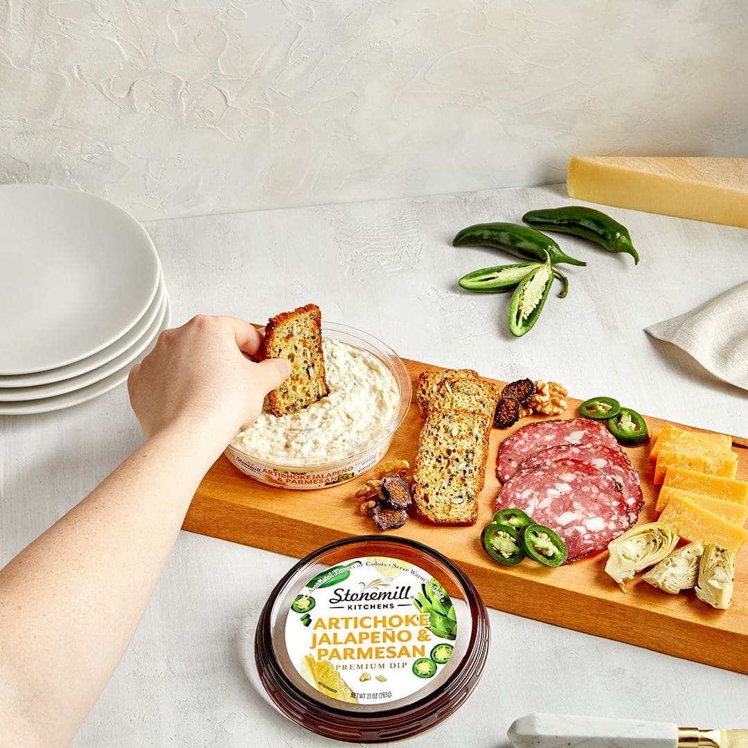 Get the party started with our party size Artichoke Jalapeño & Parmesan Dip! Zesty jalapeños, cool sour cream, and savory Parmesan cheese combine to create a dip that is as tasty served with tortilla chips as it is broiled on meats.