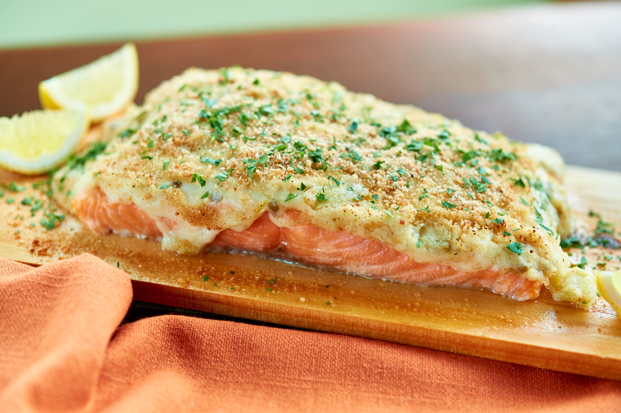Cedar Plank Salmon with Artichoke & Jalapeño Topping